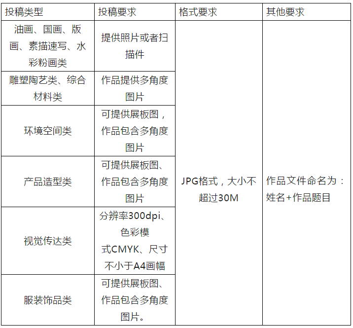 (1)油畫類(2)國畫類 (3)版畫類 (4)雕塑陶藝類 (5)水彩粉畫類 (6)素描速寫類 (7)綜合材料類