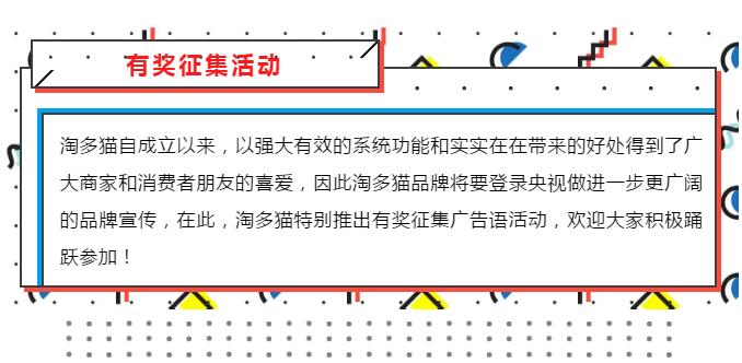 淘多貓擬定在央視三個頻道播放廣告,現進行全網廣告語征集活動,報名參加,則有機會獲得萬元大獎!